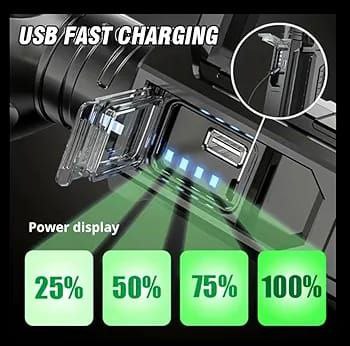 ➡️اضاءه تصل لاكثر من 1000 متر🤩 4 أوضاع للاضاءة 🔻 مرتفع 🔹متوسط 🔹منخفض🔹متردد اضاءة🔹يعمل لمدة من 3 الي 6 ساعات🤩كما انه مزود بخاصيه الباور بانك لشحن الهواتف 🤫وكما ايضا مرفق معه الحامل لاقوى للتثبيت في اي مكان