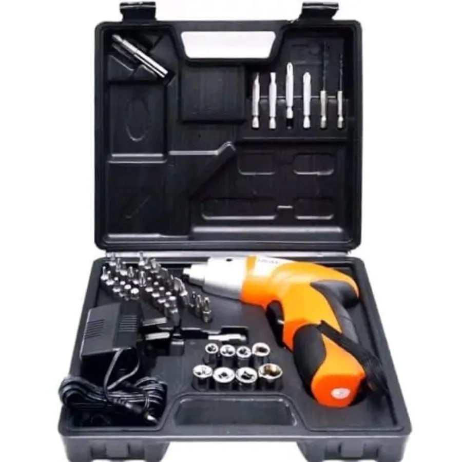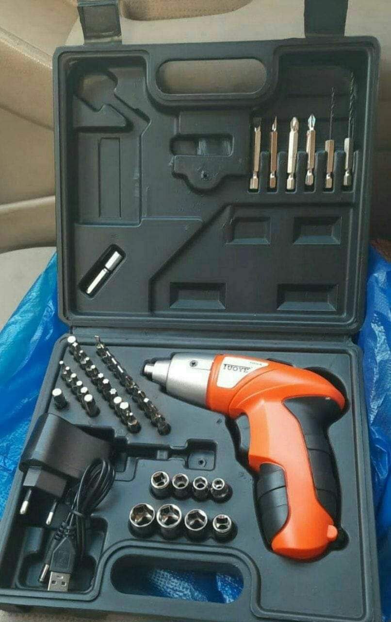 ✅️هذه الحقيبة تحتوي على دريل مفك كهربائي قوي ومتعدد الاستخدامات، بالإضافة إلى مجموعة متنوعة من القطع والمقابس التي تناسب ✅️جميع أنواع البراغي.مكون من 45 قطعة