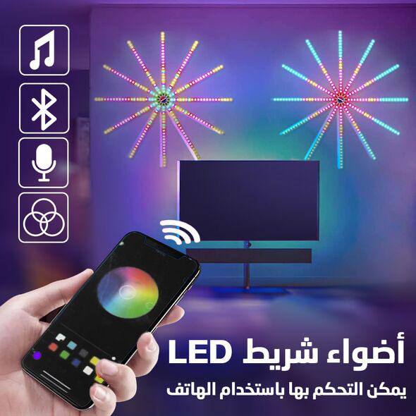 🎆🎇تضيف غلرفتك أو محلك رونقا و جمالا تتفاعل مع الموسيقى و الايقاعات و الأصوات على حسب اختياؤكاختر بين أكثر من 100 وضع و شكل عن طريق جهاز التحكم أو تطبيق الهاتفتدعم 16 مليون لون بفضل تقنية RGB